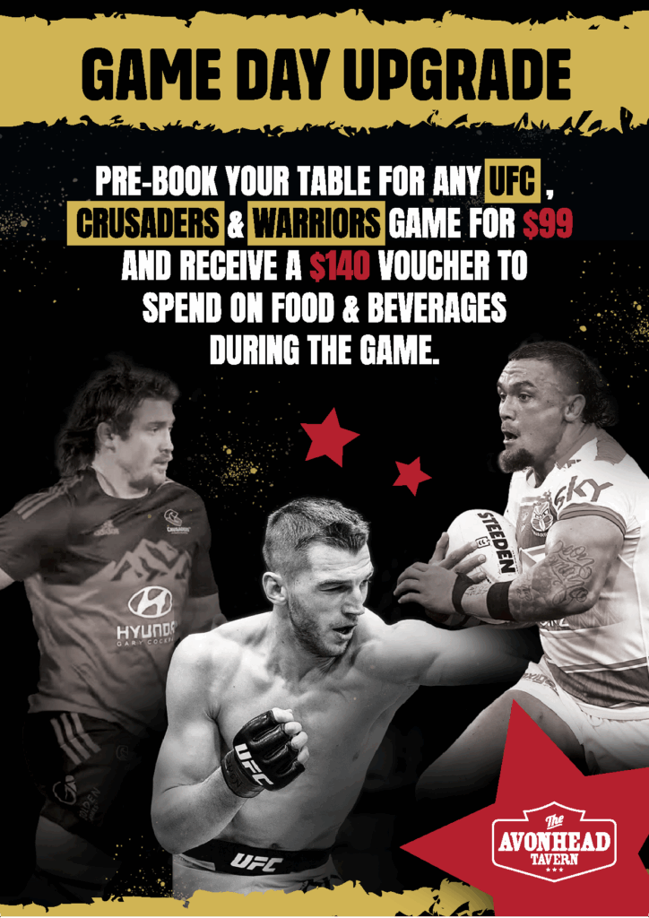 To book your table in the bar for sport phone 03 358 8960 or email info@avonheadtavern.co.nz